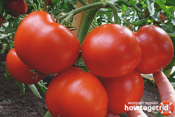 Les jarretières sont fabriquées trois fois par saison, tandis que vous devez toujours saisir des grappes lourdes avec des fruits. Étant donné que la plante est haute, elle doit être attachée à la barre transversale afin qu'il soit pratique de prendre soin de la tomate.