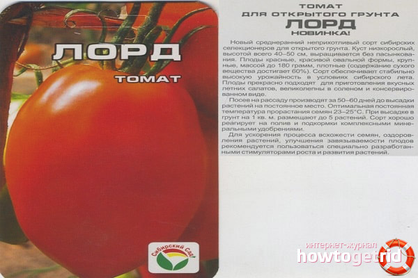 La variété de tomate Lord a été élevée par l'Institut de recherche sibérien d'économie agricole. Initialement, il était destiné à être cultivé en Sibérie occidentale. Cependant, des études ont montré que la variété est cultivée dans d'autres régions de la Russie. Les tomates chez les acheteurs sont appréciées pour leur goût. Les jardiniers choisissent cette variété en raison de la simplicité des conditions de croissance.