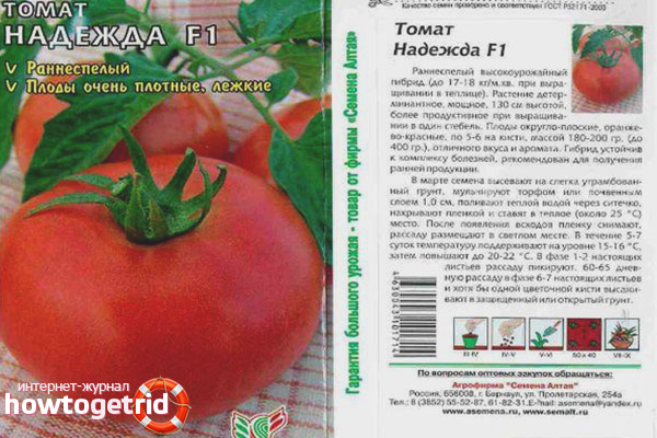 La tomate hybride mûre précoce Nadezhda F1 convient à la culture en serre chauffée, en serre sans chauffage, sur un terrain ouvert. La plante est déterminante, la croissance s'arrête au début de la fructification.
