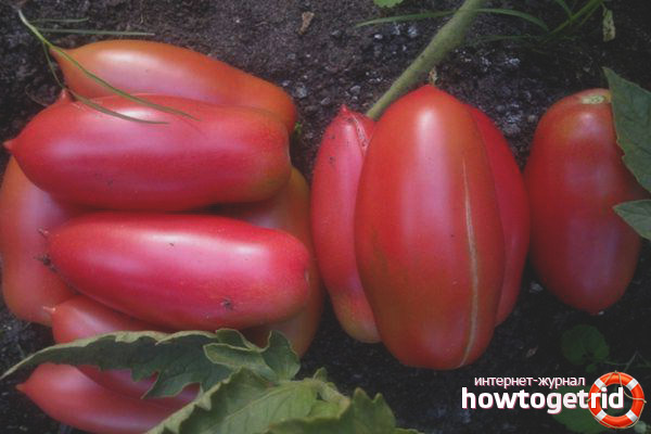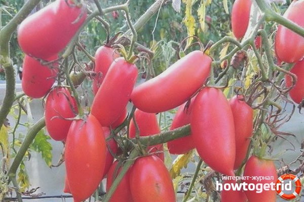 Les fruits eux-mêmes sont de forme ovale allongée avec un nez long, fin et prononcé. Le rapport de la longueur de la tomate à la largeur 3: 1. Il pousse principalement de 9 à 13 cm et les légumes sont récoltés dans des brosses spectaculaires. Généralement, leur nombre est de 4 à 8 pièces. Dans chaque pinceau, jusqu'à 10 fruits mûrissent.