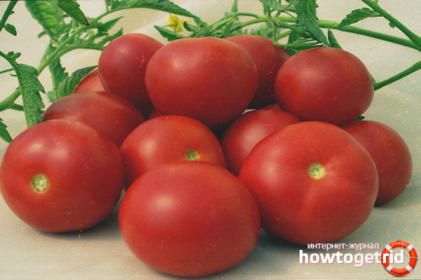 La hauteur des buissons atteint 50 cm Les feuilles sont de taille moyenne, vert saturé. Les fruits commencent à être attachés sur la 7e feuille, répétez les ovaires sur 1 feuille. Sur une douille, 4 brosses sont formées. Sous réserve des règles des techniques de culture agricole, un kg de tomates mûres peut être récolté sur un mètre carré.