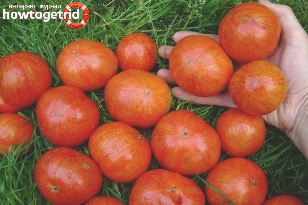 Le maître d'équipage Tomates Tolstoï a non seulement un nom original, mais aussi une couleur. Une tomate a des lanières - jaune et rouge - il est donc très facile de distinguer une variété des autres.