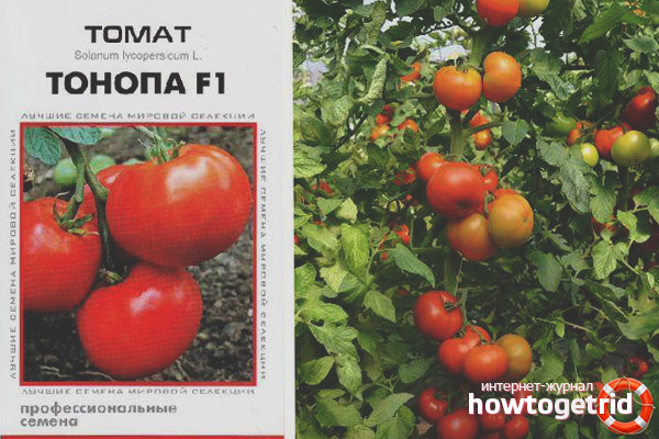 L'hybride Tonopa F1 est un déterminant. C'est une plante puissante avec un système racinaire développé, un grand nombre de feuilles et une excellente dissimulation des fruits. Les branches sont entièrement recouvertes de fruits, sur la brosse il y a généralement jusqu'à 7 légumes, et la période de formation et de maturation est de 70 à 80 jours.