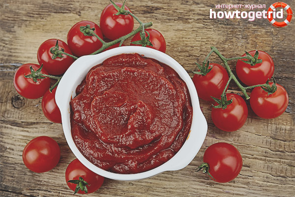 Le contenu du produit est caractérisé par un grand nombre de représentants de la série des acides organiques. Cela provoque un effet irritant sur la muqueuse de l'estomac et des intestins. Les personnes qui ont des problèmes à cet égard, après avoir mangé un plat avec de la pâte de tomate, peuvent souffrir de brûlures d'estomac.
