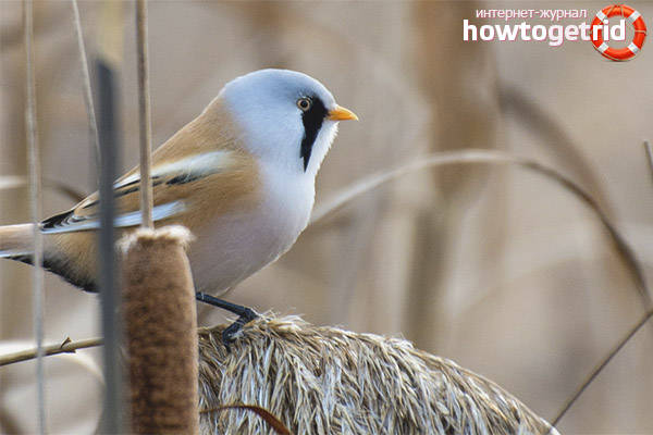 La mésange à moustaches ressemble à un petit oiseau plutôt vivant, on l'appelle aussi la mésange à barbe, ainsi que la barbu. Les couleurs exquises de son plumage sont une caractéristique de l'image extraordinaire de cet oiseau. Les mâles d'une mésange barbu sont habillés plus vivement, leur tête et leur cou sont peints en gris-bleu, sur le dos il y a un plumage de couleur blé, ombré par un ton rougeâtre, et le ventre du muet est peint dans des tons rose clair.