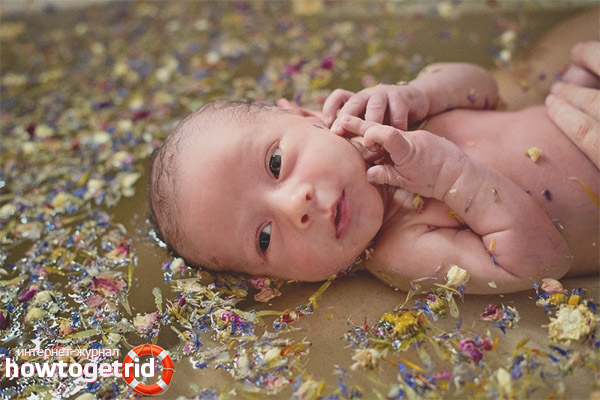- Souvent, diverses décoctions à base de plantes sont ajoutées à l'eau. Cependant, cela ne vaut pas la peine de le faire au premier bain, s'il n'y a pas de recommandations nécessaires de la part du néonatologiste de la maternité ou du pédiatre personnel. Il ne faut pas oublier que l’utilisation fréquente de ces composants, ainsi que du permanganate de potassium, peut entraîner des réactions allergiques et perturber l’équilibre naturel de la peau du bébé.