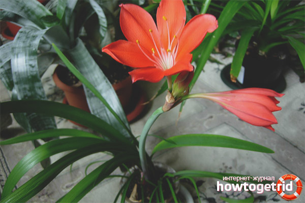 Les fleurs de Wallota sont situées sur un long pédoncule, qui n'a pas de sépales, et elles sont rassemblées dans un "parapluie". Vous pouvez généralement compter de 3 à 9 fleurs sur une plante. Selon la variété, ils sont rouge vif, rose pâle et orange. Les feuilles ressemblent à la forme d'une épée et leur couleur vert foncé au pétiole devient violette.
