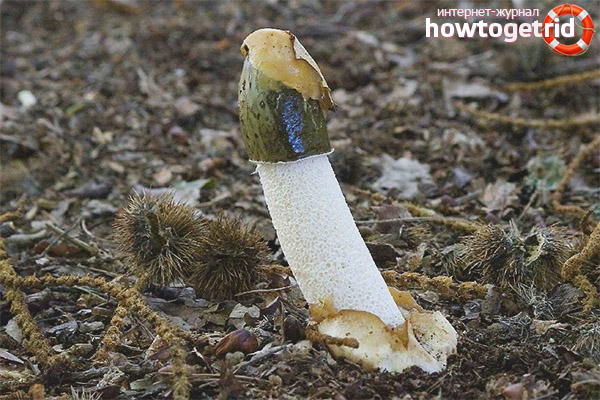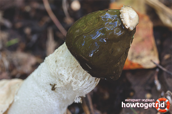 - En haut, la base, comme un hémisphère, est pigmentée dans un ton noir et vert. La jambe est couverte de mucus, qui sent, pour le moins, pas très agréable. On dirait que l'apex est charnu et résistant, tandis que la base du corps fructifère est lâche. Dans la partie inférieure, ce champignon est attaché au mycélium.