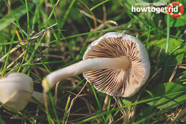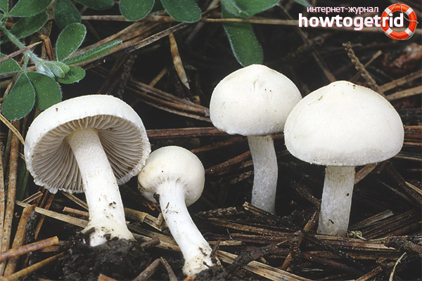 - La seule chose qui mérite d'être mentionnée est que les corps fruitiers avec des chapeaux blancs sont un peu comme un mycène pur, qui appartient à la catégorie des champignons non comestibles. Cependant, ce dernier a une couleur de chapeau de Dun. En même temps, il est humide et les bords ont des sillons. Un tel exemple a une odeur de radis et la jambe est creuse.