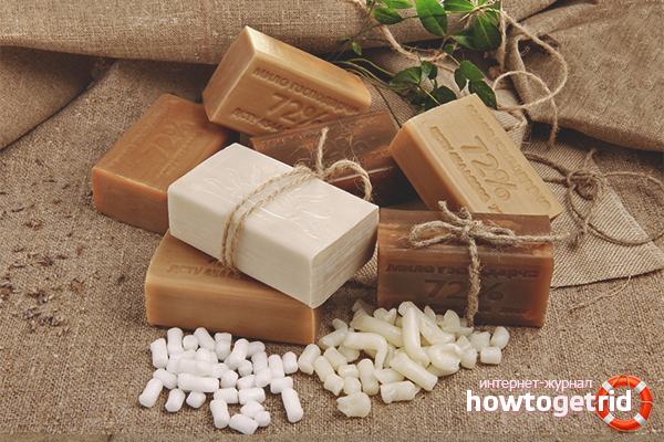 Si nous parlons des types, le savon à lessive est disponible sous forme liquide et solide (barres), pommades, poudre. Un produit traditionnel est considéré comme hypoallergénique, en raison de l'absence d'irritation, les personnes allergiques peuvent l'utiliser. Le savon à lessive est célèbre pour ses propriétés antibactériennes.