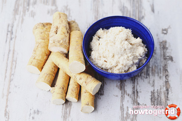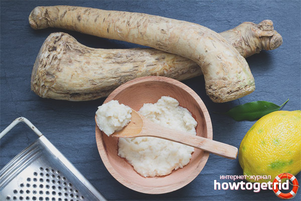- Nous prenons 100 g de raifort râpé, ajoutons un peu de miel et de jus de citron. Nous déplaçons les composants dans des plats en verre et les fermons hermétiquement. Un tel mélange peut être conservé au réfrigérateur pendant 3 jours. Utilisez le produit deux fois par jour avant les repas. Le cours optimal dure environ un mois.