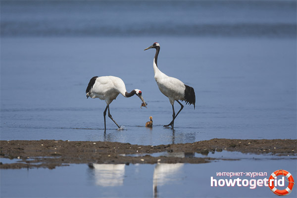 - Il est intéressant d'observer le comportement des grues lors de l'alimentation. Ils baissent la tête pour arroser et geler. Les oiseaux attendent que les proies se rapprochent le plus possible. Des individus attrapent la victime et l'avalent à une vitesse incroyable. Les grues mangent également des rhizomes, des bourgeons végétaux, des céréales, des jeunes pousses, etc.
