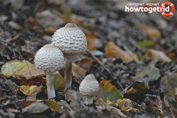- Chlorophyllum plomb-laitier ou parapluie de Morgan (Chlorophyllum molybdites). Le champignon est très toxique et ressemble en même temps à un parapluie rougissant. Le chapeau varie en taille de 10 à 30 cm, blanc avec des écailles brun-rose. À un jeune âge, il ressemble à une balle, puis s'ouvre à plat. La jambe est également lisse, avec un anneau dans la partie supérieure. La chair devient rouge sur la coupe, mais elle n'a pas d'odeur prononcée. Le champignon est répandu à la fois en Eurasie et en Afrique, en Australie et en Amérique. Les assiettes sont blanches, mais si vous les appuyez, elles jaunissent et parfois brunissent. Les vieux champignons ont des plaques verdâtres de couleur olive.