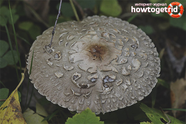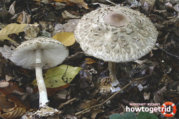 - Parapluie panaché (Macrolepiota procera). La taille de ce champignon est plus grande, c'est-à-dire que le chapeau dépasse 20 cm de diamètre. La tranche ne change pas de couleur.