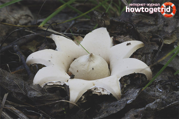Un champignon comme une étoile de mer, en plus de son nom principal, est également connu sous le nom de geastrum ou étoile de terre. Le corps du fruit pousse sous la surface de la terre, formant une sorte de sac. En cours de croissance, le chapeau de champignon sort, faisant son chemin, tandis que sa surface éclate, en raison de laquelle les extrémités d'emballage se forment. C'est-à-dire que le champignon mûr avec ses caractéristiques externes ressemble fortement à une étoile avec plusieurs rayons spongieux encadrant la partie centrale.